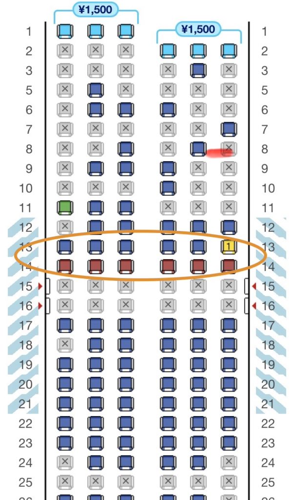 ○で囲った所の赤い座席は、リクライニングシート(座席が倒せない)ではない代わりに空いていることがとても多いです。