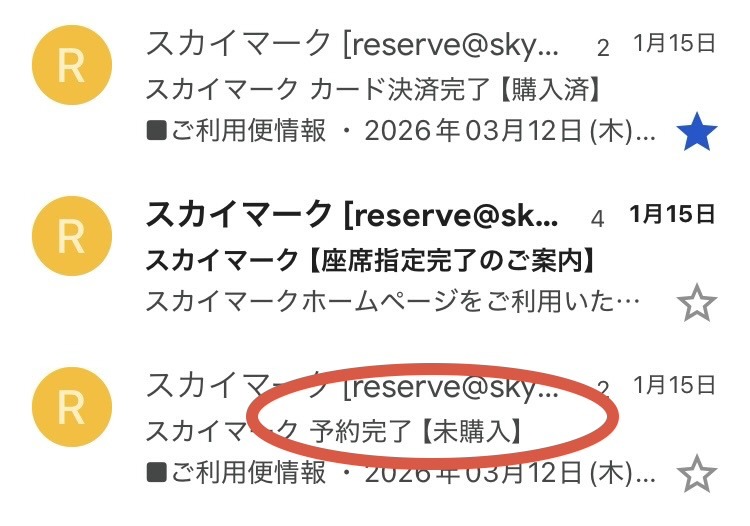 ↑の画像のようにスカイマーク公式から「予約完了メール」が届いていなければ予約は完了しておりません。