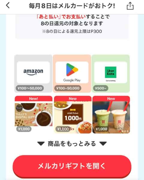 メルカリギフトから、ギフトカードをあと払いで購入することで8%の還元がつきます。