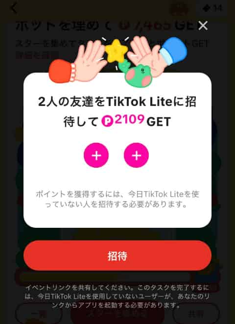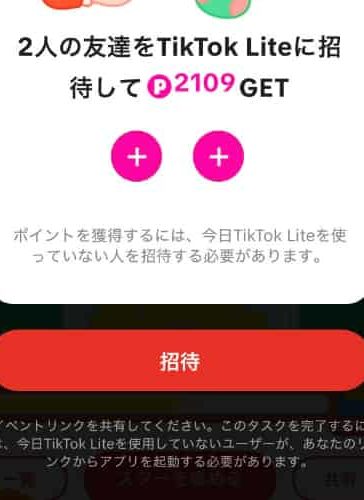 既存ユーザーがOKの場合は「ポイントを獲得するには、今日TiktokLiteを使っていない人を招待する必要があります。」と下に条件が書いてあるものだけなので注意しましょう。